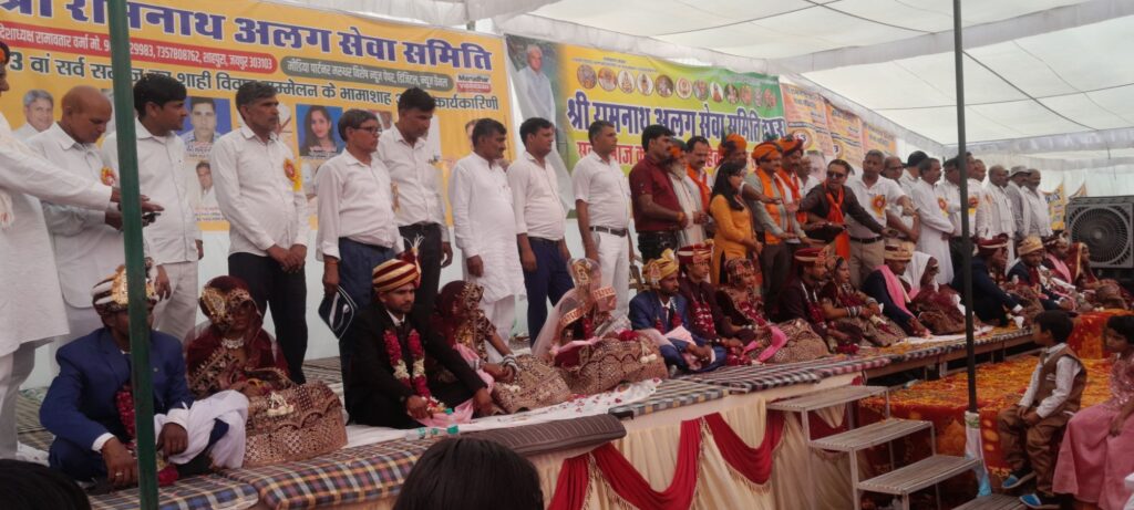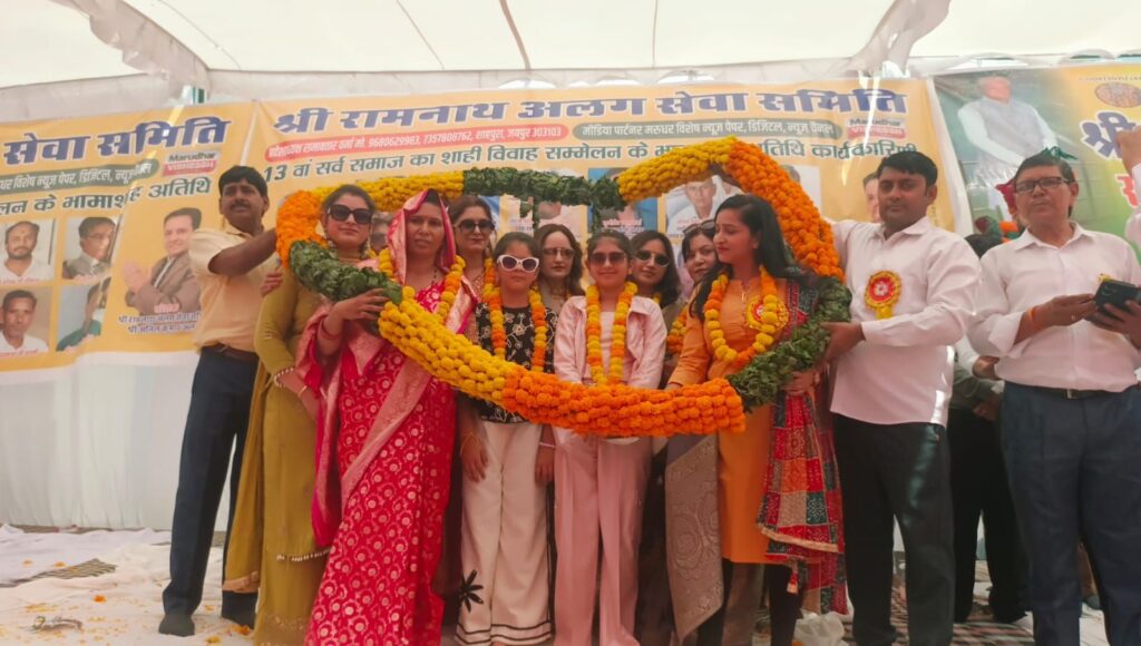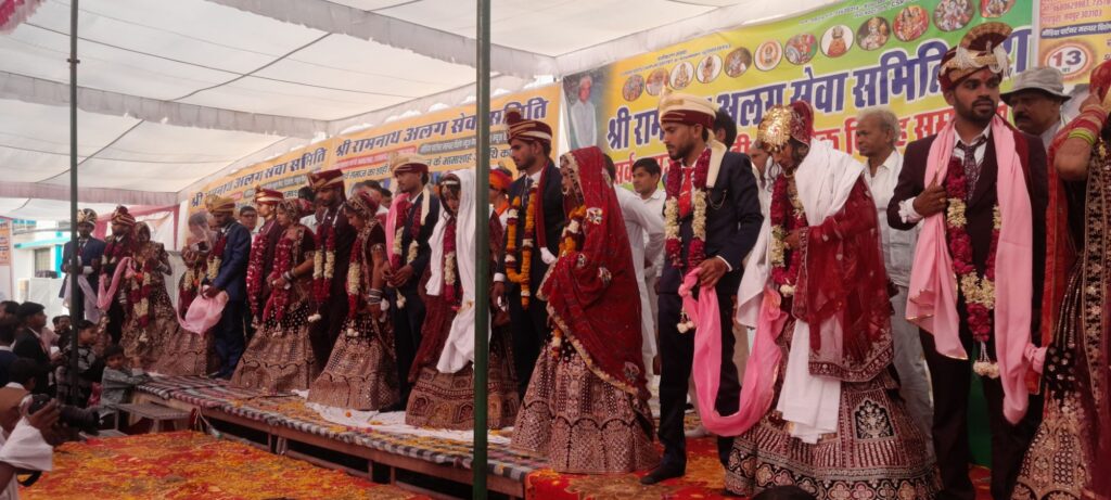 नीमराना (रमेशचंद), 26 अप्रैल 2026। कस्बे के आर्य पब्लिक स्कूल प्रांगण में रविवार को श्री रामनाथ अलग सेवा समिति द्वारा 13वां सर्वसमाज सामूहिक विवाह सम्मेलन हर्षोल्लास से संपन्न हुआ। सम्मेलन में 11 जोड़ों ने एक-दूसरे का हाथ थामकर सात फेरे लिए। आयोजन का मुख्य आकर्षण रही 11 दूल्हों की एक साथ निकाली गई भव्य निकासी, जो कस्बे में चर्चा का विषय बन गई। लोगों ने इस सामाजिक सरोकार की पहल को खुले दिल से सराहा।